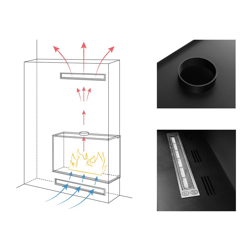 Na górze biokominka znajduje się otwór o średnicy 100mm, można go połączyć z górną kratką wentylacyjną, jednakże połączenie nie jest konieczne. Ważne by w zabudowie była pusta przestrzeń, aby ciepło mogło swobodnie przepływać.