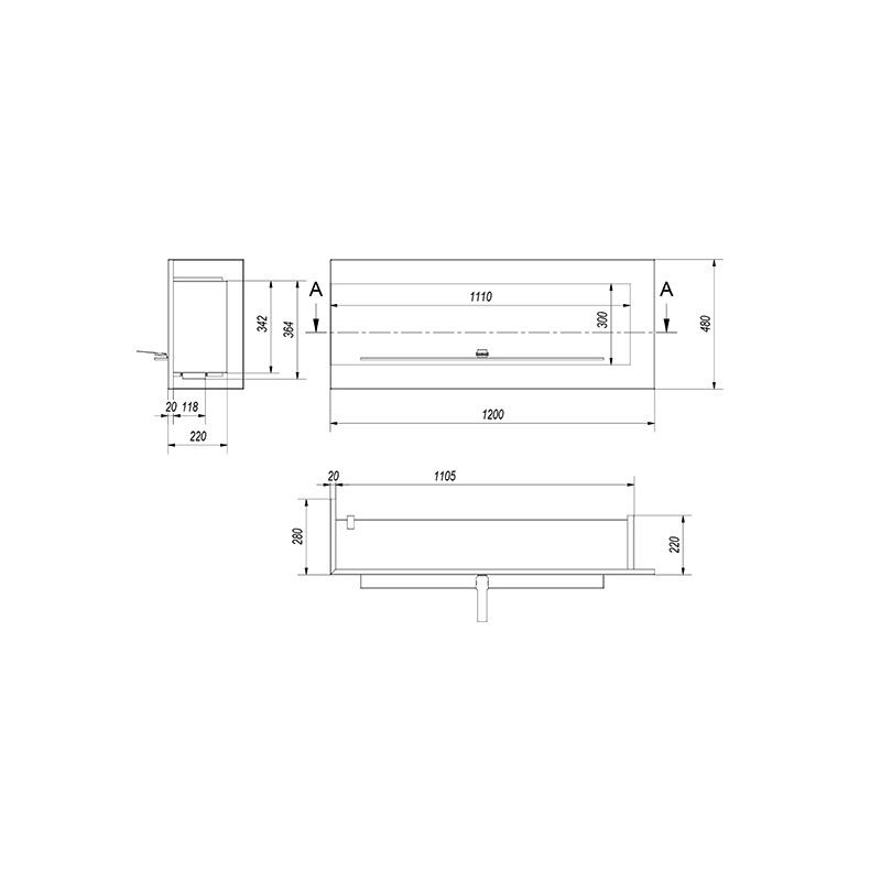 Wymiary: wysokość 480 mm, szerokość 1200 mm, głębokość wnęki do zabudowy 200 mm.