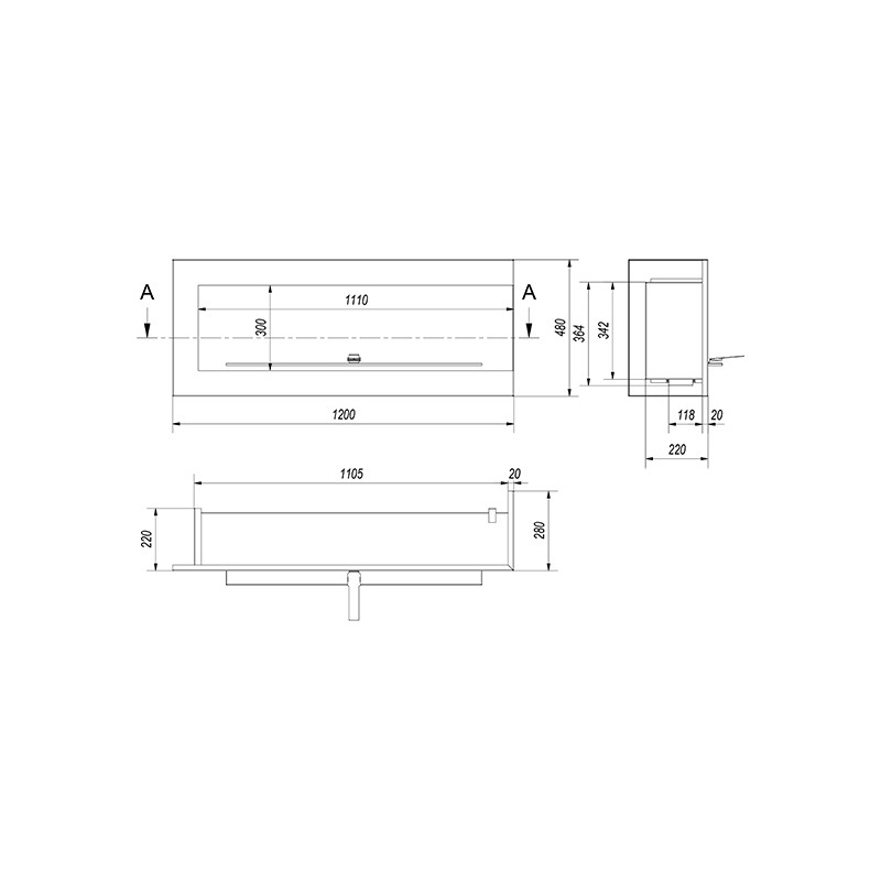 Wymiary: wysokość 480 mm, szerokość 1200 mm, głębokość wnęki do zabudowy 200 mm.