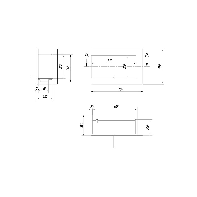 Wymiary: wysokość 480 mm, szerokość 700 mm, głębokość wnęki do zabudowy 200 mm.