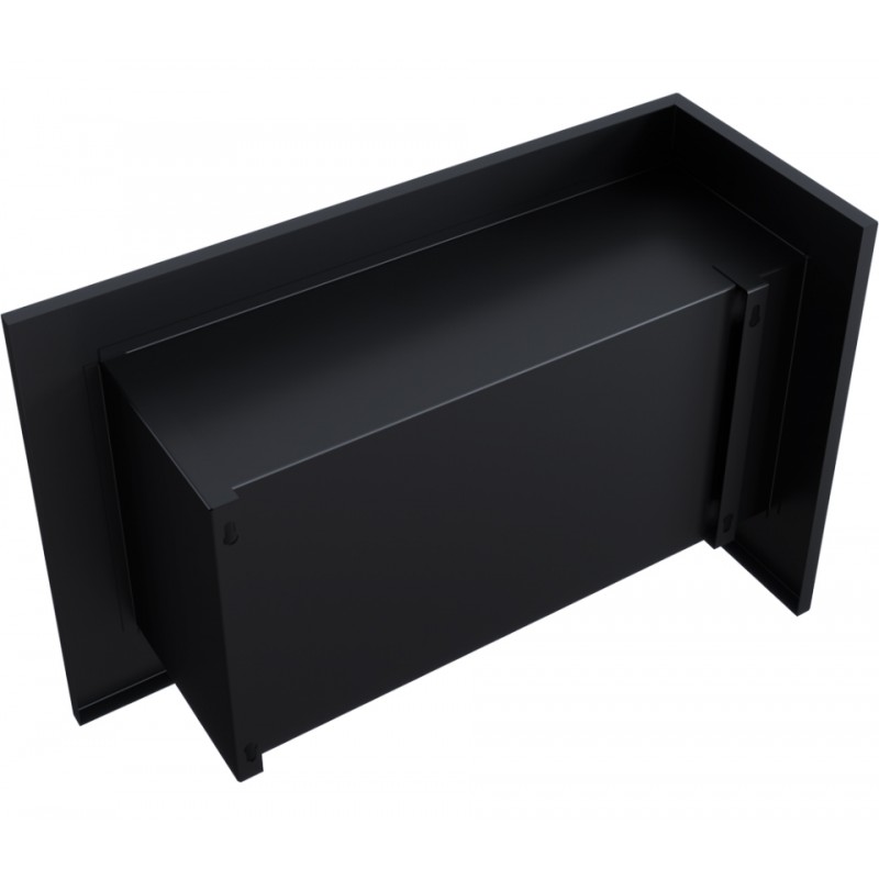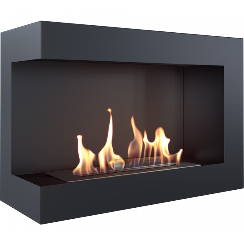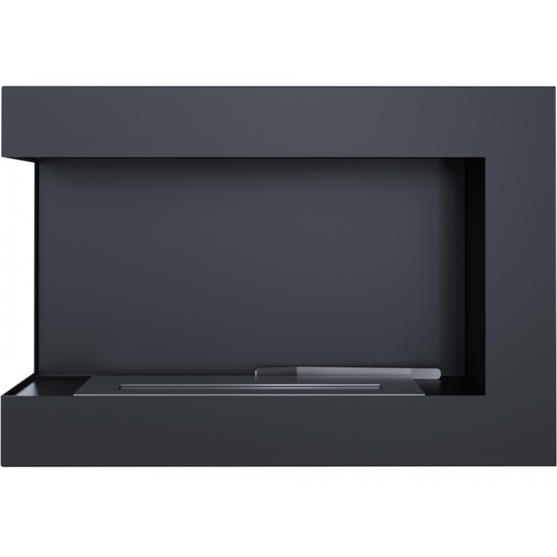 Biokominek narożny, z otwartym bokiem; wykonany ze stali lakierowanej farbą termoorporną w kolorze czarnym mat. Na odwrocie biokominka umieszczono uchwyty do zawieszenia na ścianie lub zabudowania. W zestawie są kołki rozporowe umożliwiające zawieszenie biokominka.