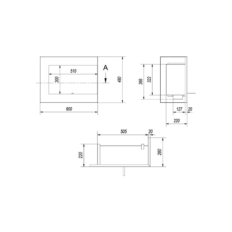 Wymiary: wysokość 480 mm, szerokość 600 mm, głębokość wnęki do zabudowy 200 mm.