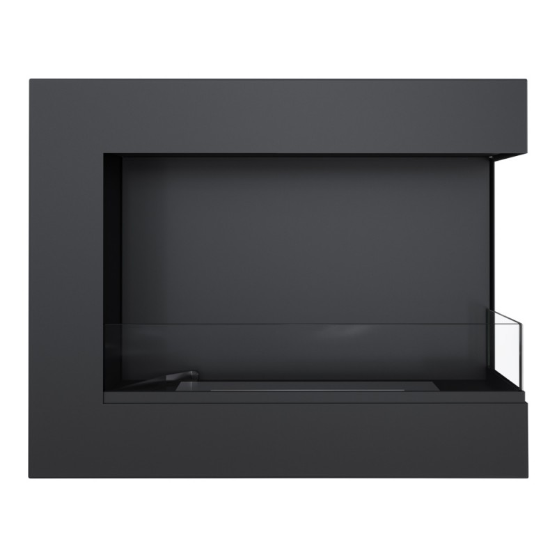 Biokominek narożny, z otwartym bokiem; wykonany ze stali lakierowanej farbą termoodporną w kolorze czarnym mat. Na odwrocie biokominka umieszczono uchwyty do zawieszenia na ścianie lub zabudowania. W zestawie są kołki rozporowe umożliwiające zawieszenie biokominka.