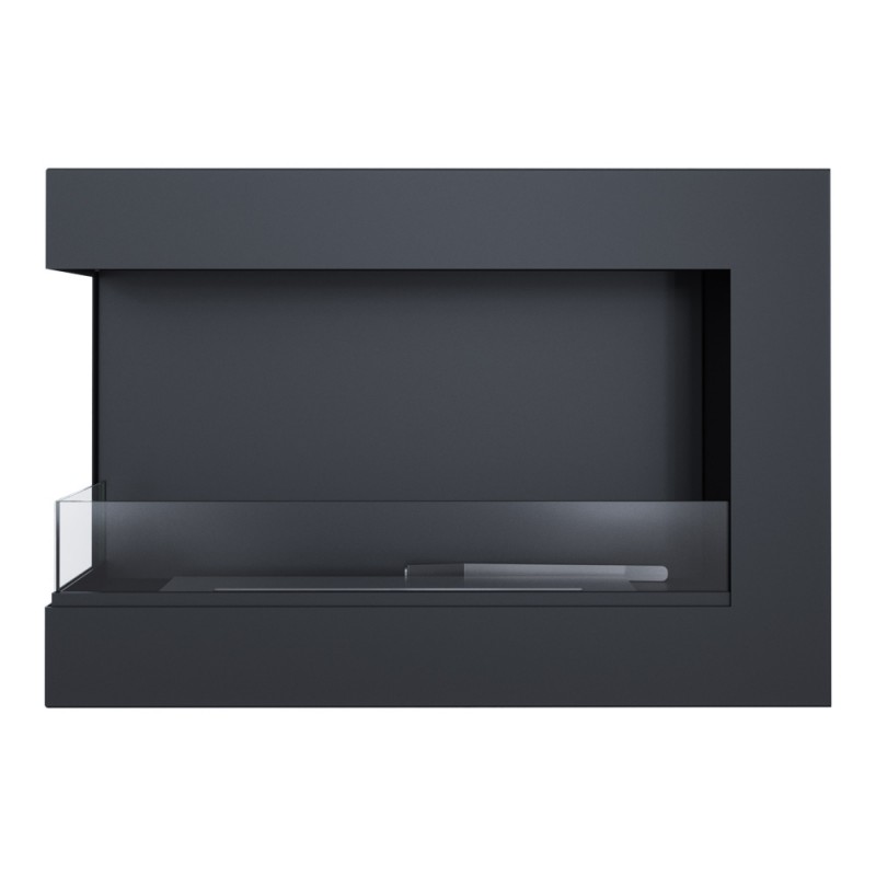 Biokominek narożny, z otwartym bokiem; wykonany ze stali lakierowanej farbą termoodporną w kolorze czarnym mat. Na odwrocie biokominka umieszczono uchwyty do zawieszenia na ścianie lub zabudowania. W zestawie są kołki rozporowe umożliwiające zawieszenie biokominka.