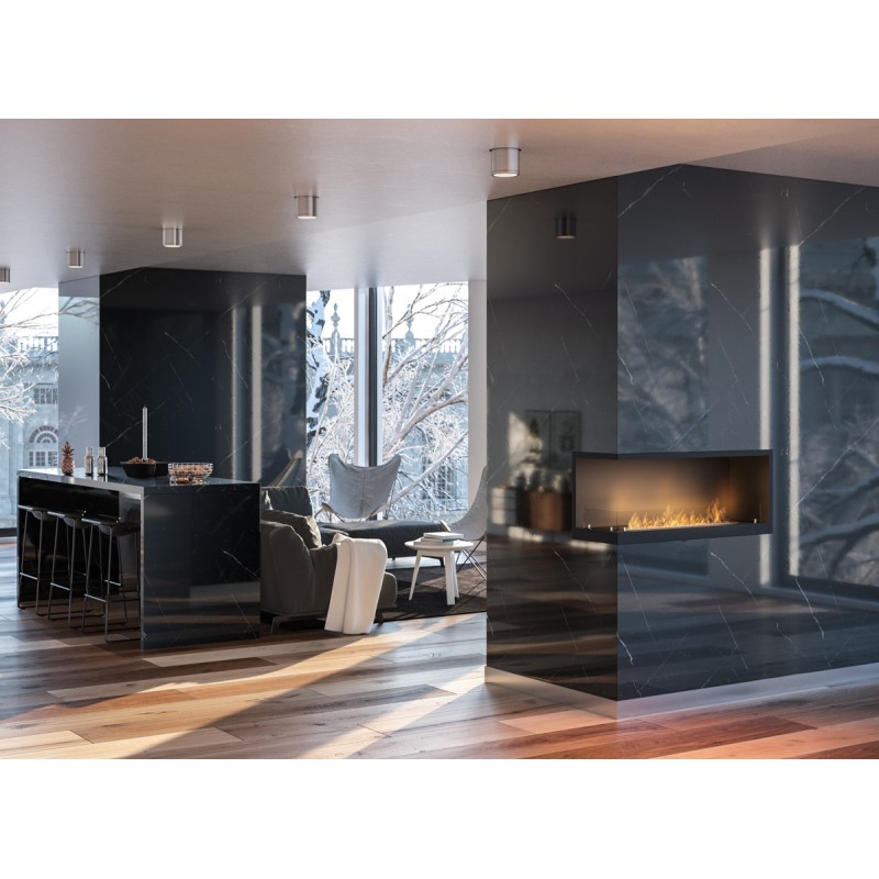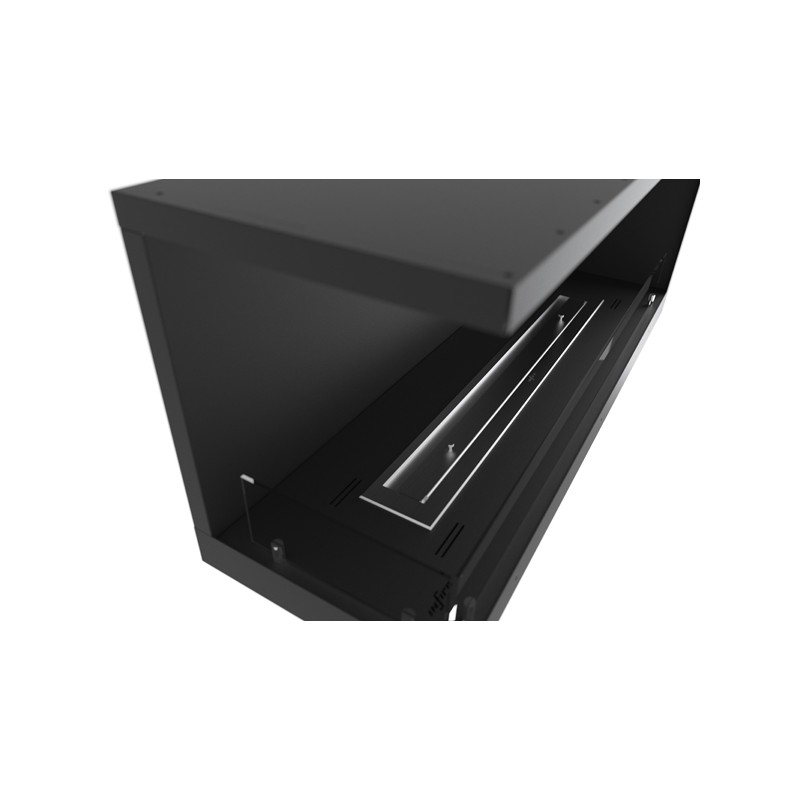 Biokominek Inside narożny wykonany ze stali kotłowej do zabudowy o szerokości 110cm z lewym otwartym bokiem