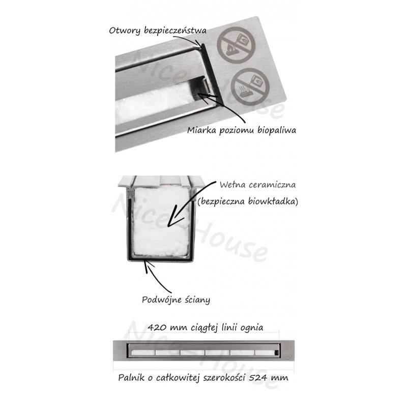 Palenisko wykonane jako jeden pojemnik o szerokości 524 mm, z podwójnym dnem wykonany ze stali nierdzewnej o pojemności około 0,75L. Biopaliwo spali się realnie w czasie około 1h50min na zalanym palniku.