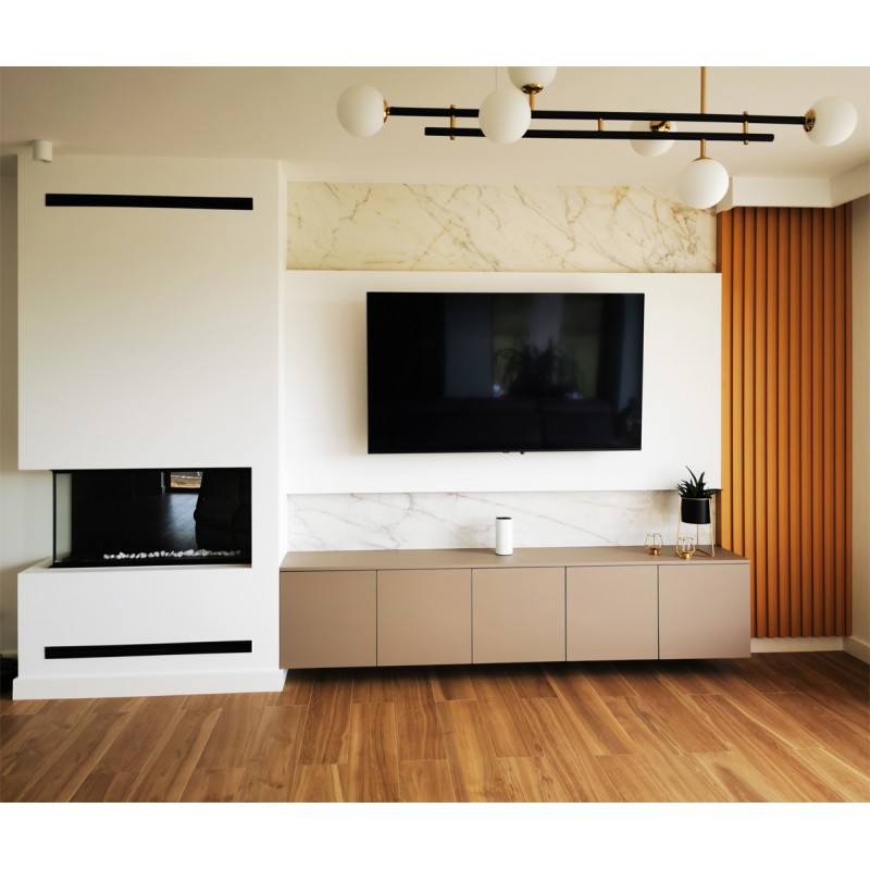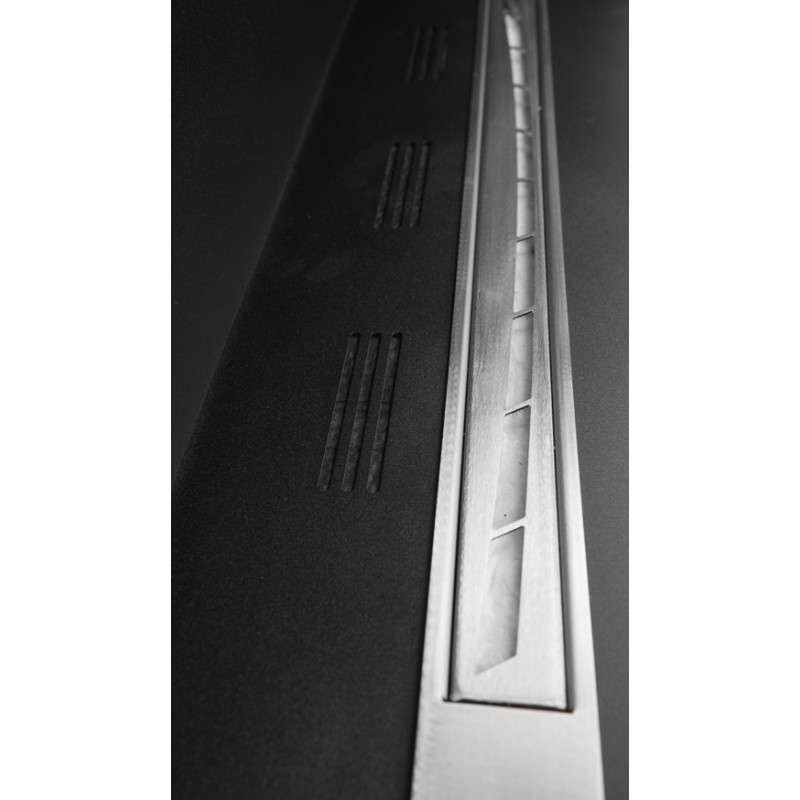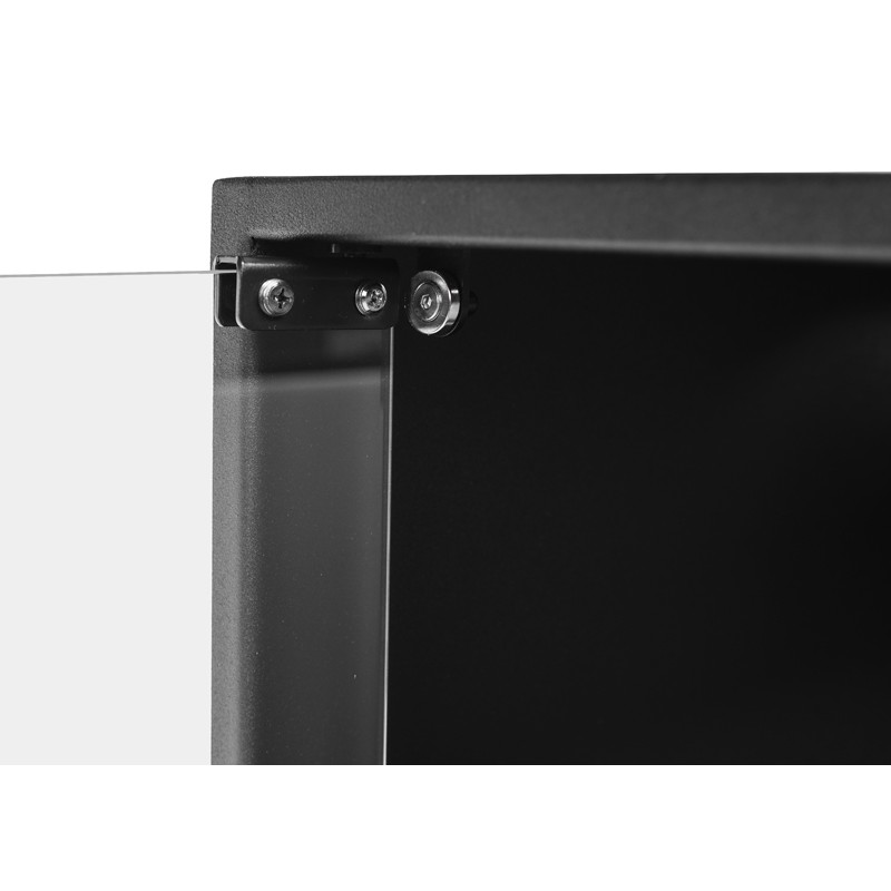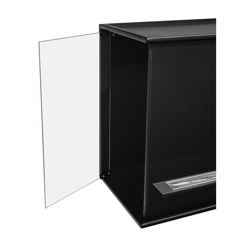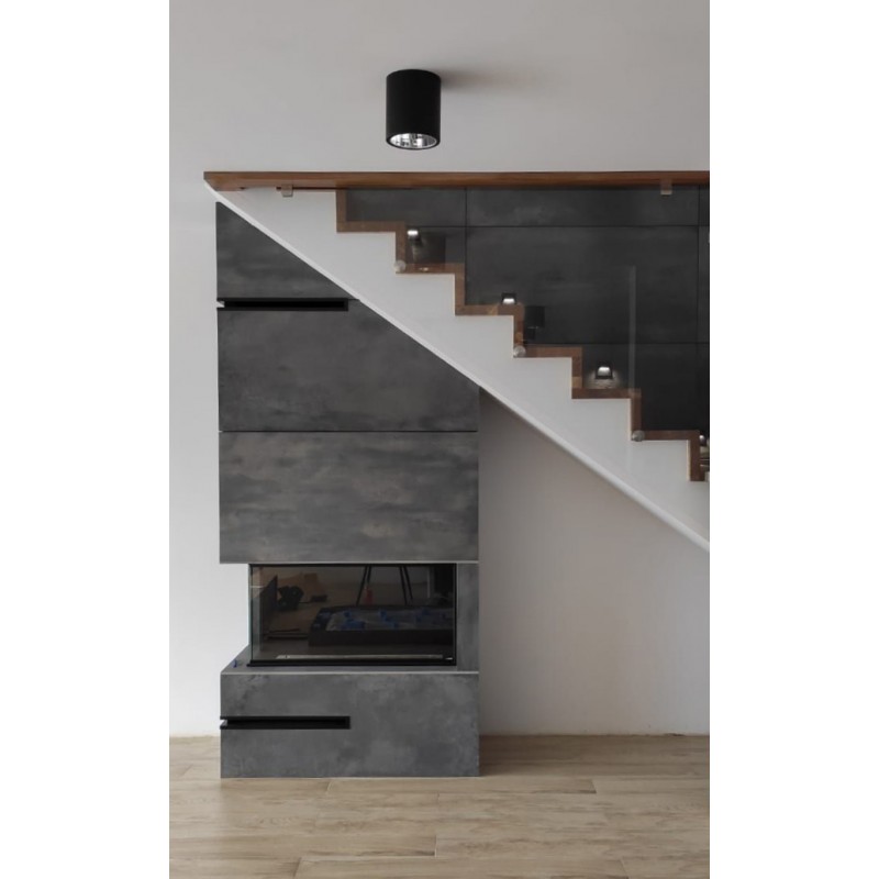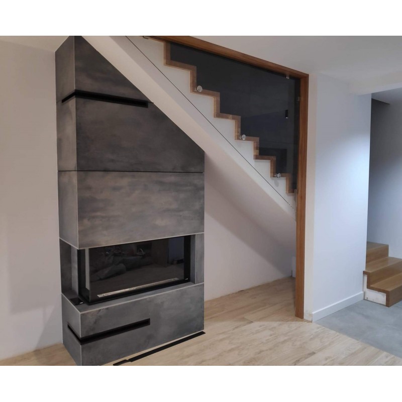 Połączenie stali nierdzewnej oraz stali malowanej proszkowo i szkła hartowanego. Model zaprojektowany aby go zabudować w ścianie, także z płyty gipsowo-kartonowej, lecz w przypadku zabudowy z g-k najlepiej użyć płyt w wersji ogniotrwałej. Frontowa rama bardzo niewielka bo o szerokości 14mm delikatnie podkreśla design wnętrza. Nadaje się do wnętrz nowoczesnych jak i klasycznych.