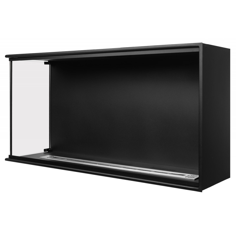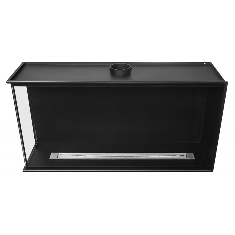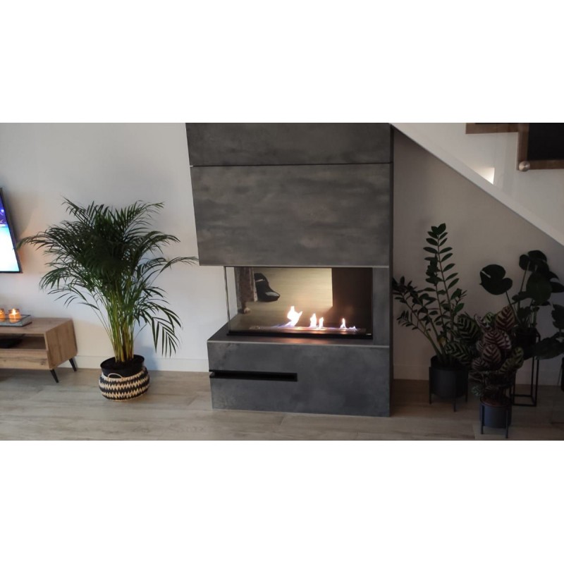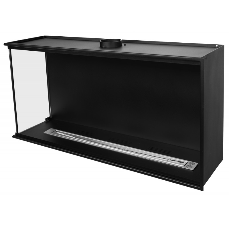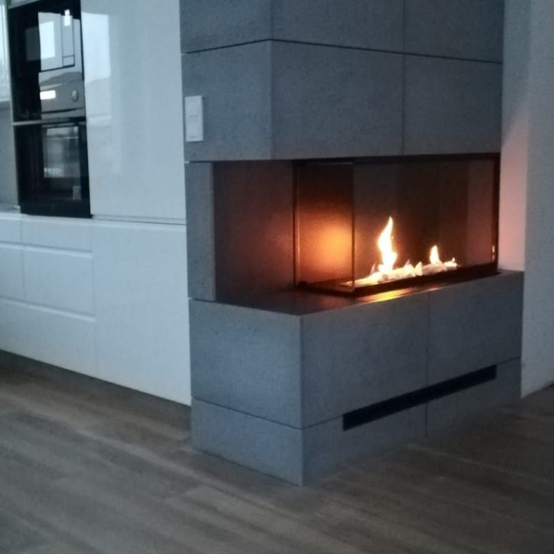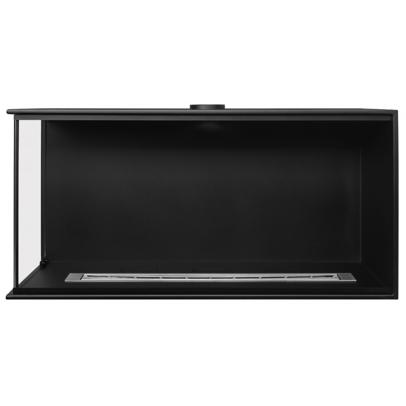 Wkład do zabudowy narożnej o szerokości 100cm, wersja lewa otwarta, biokominek posiada dwie szyby na całej wysokości.